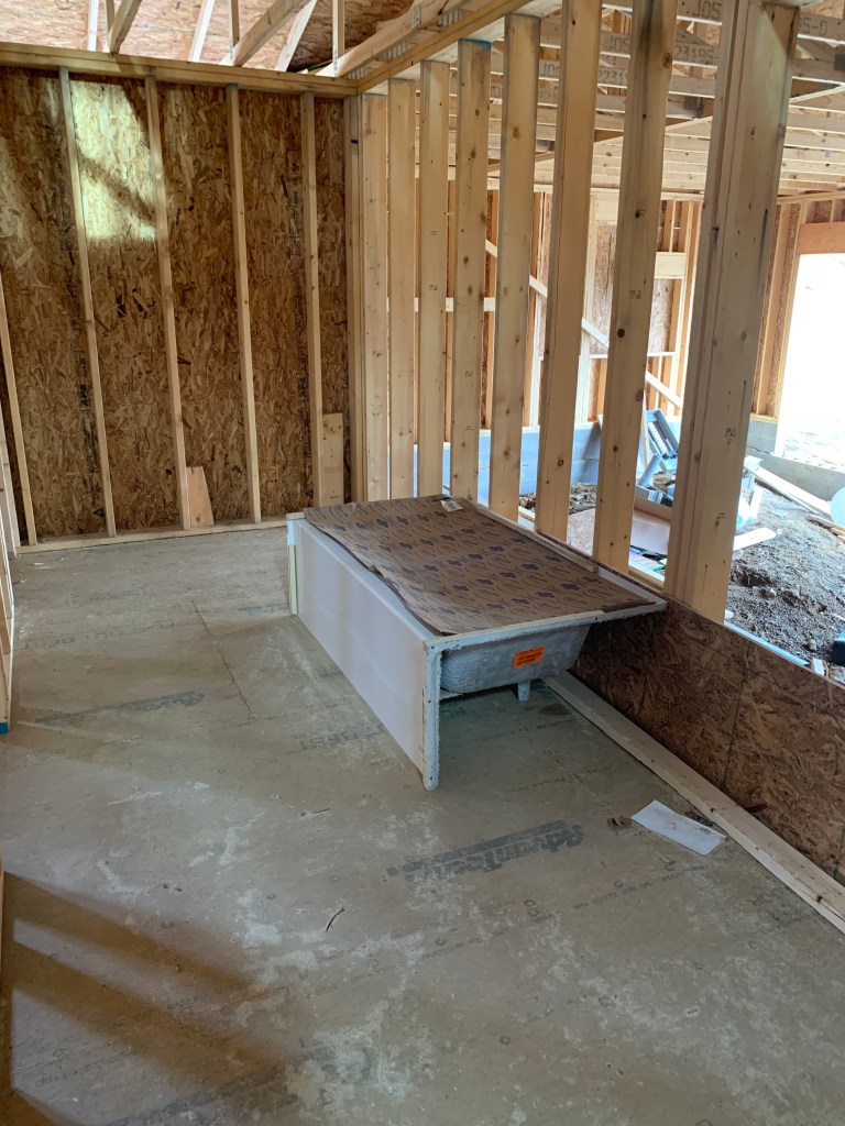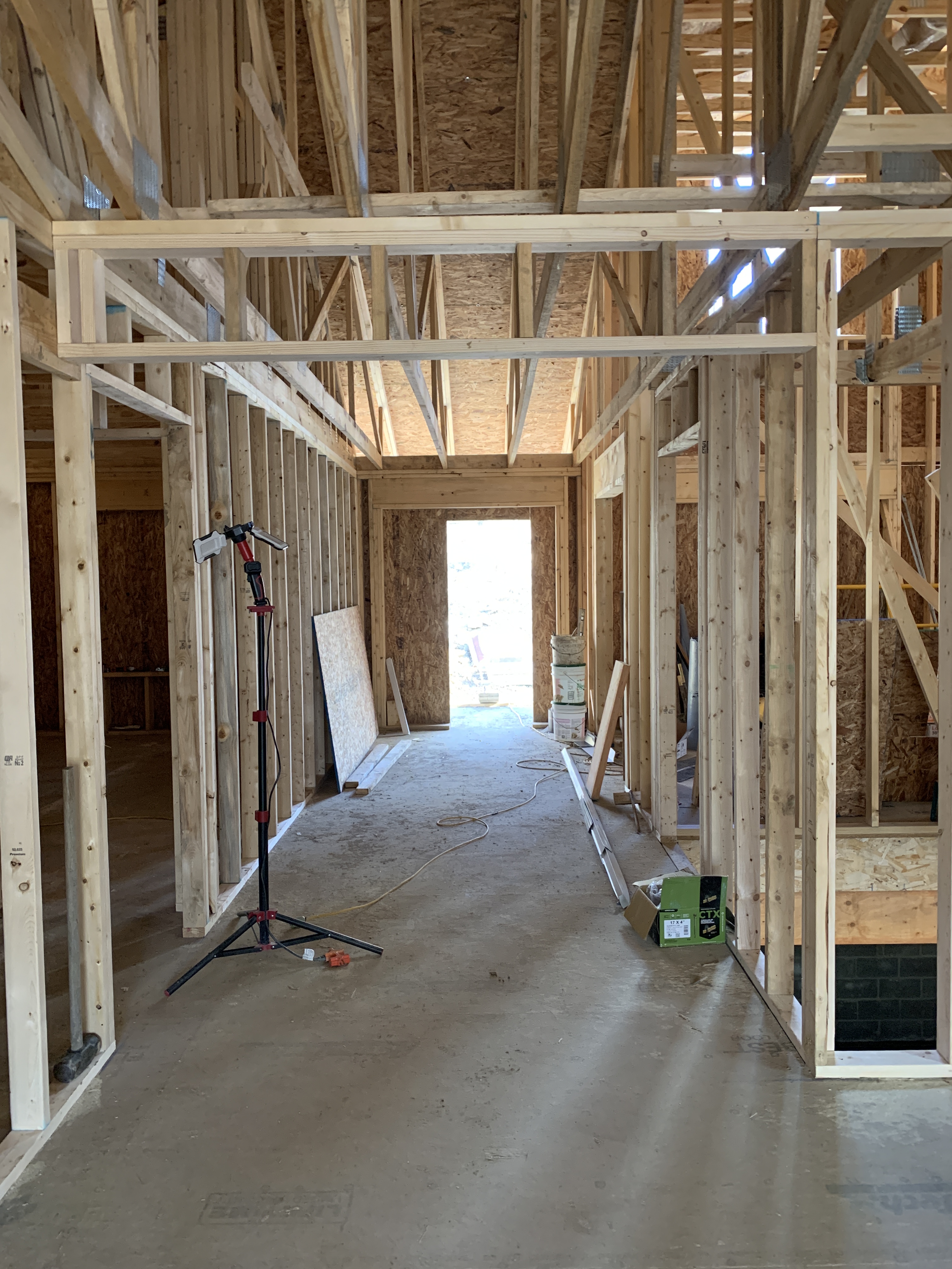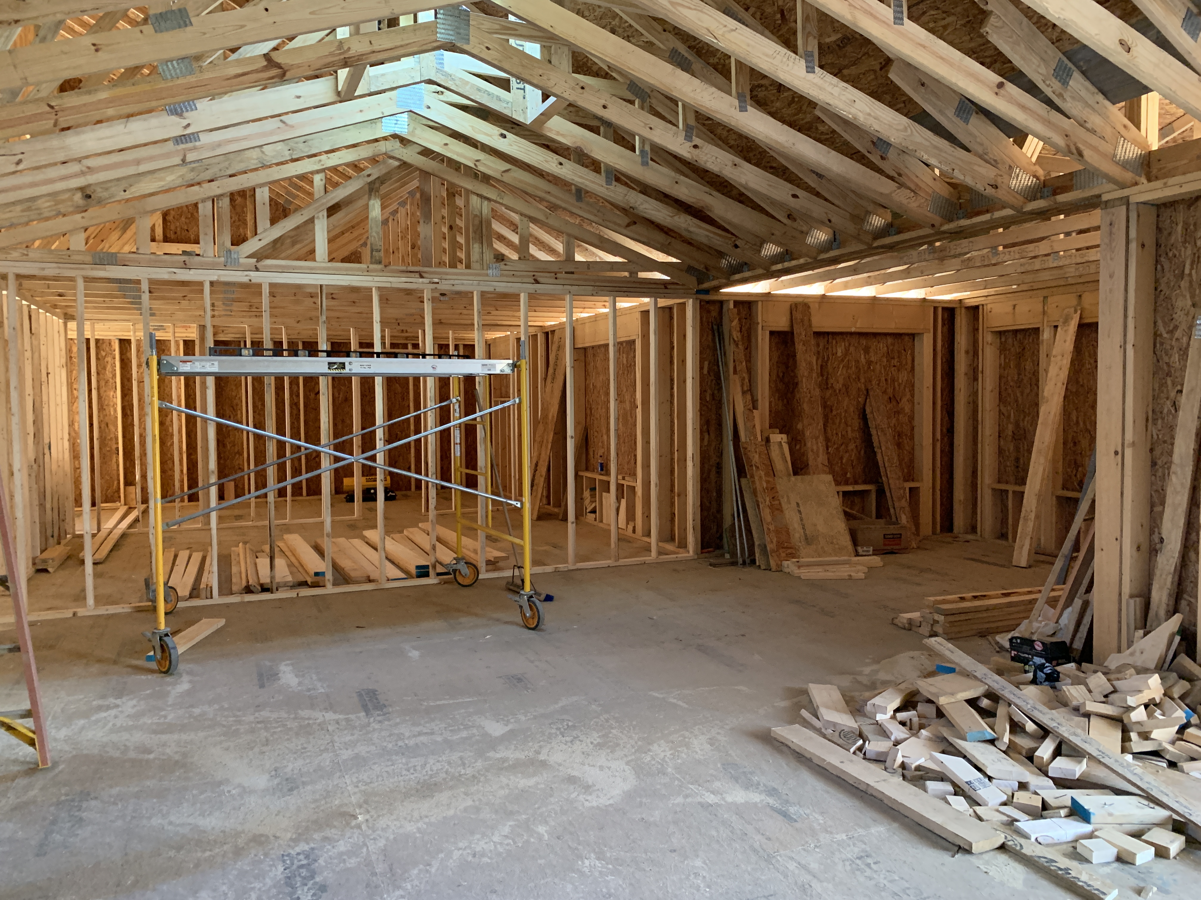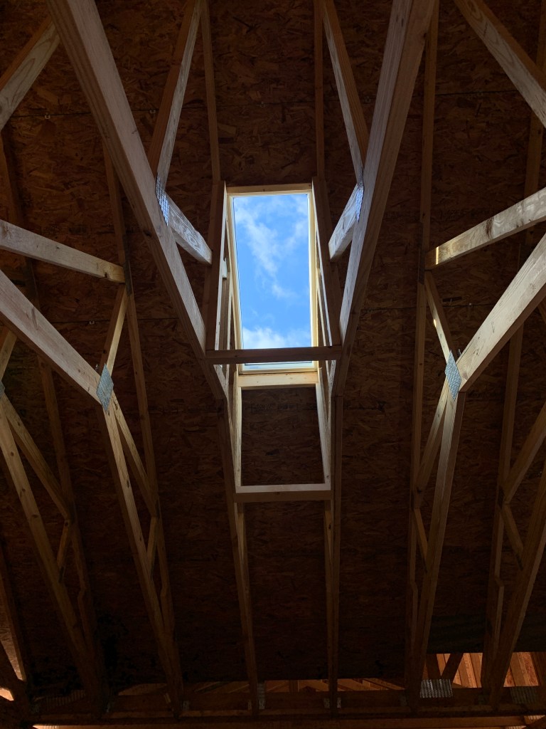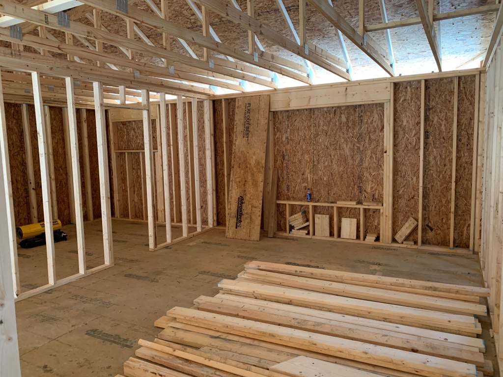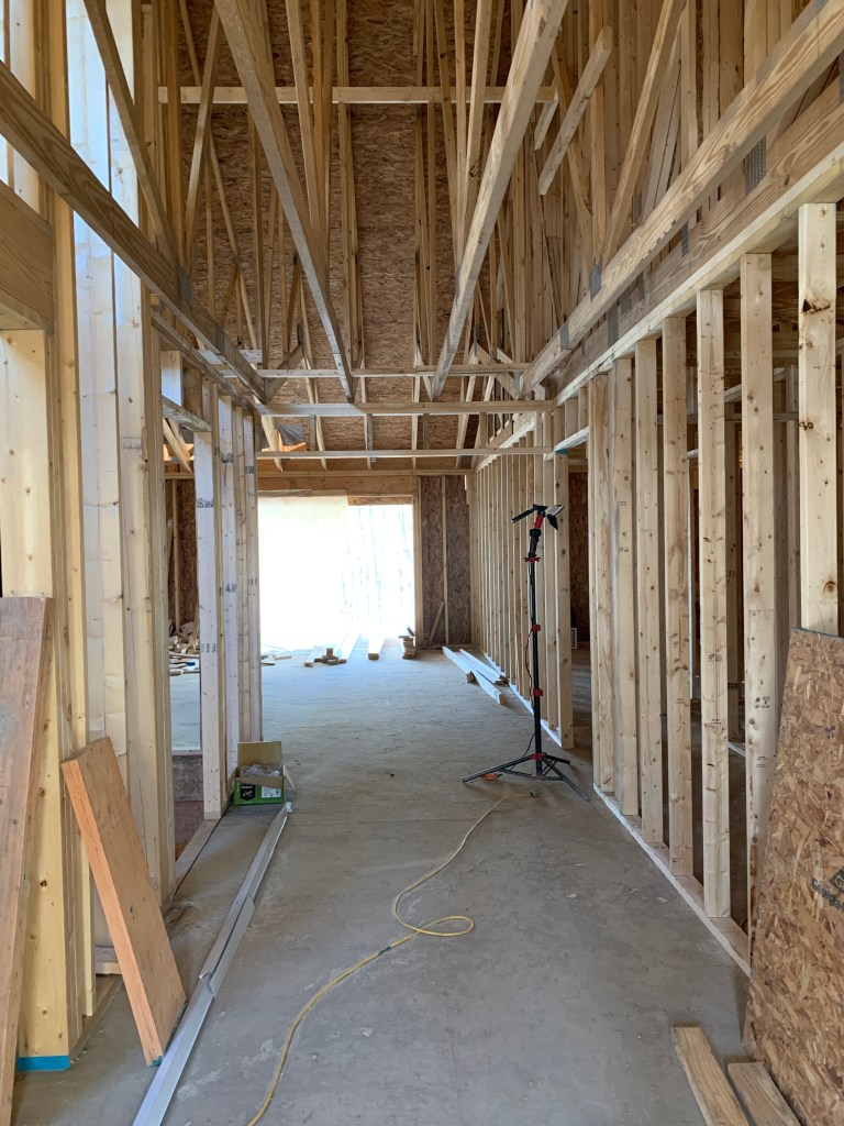 I was so busy watching the roof go up that I didn’t even realize the interior was getting framed out. Seriously. I normally go over every day and see what’s new, but I didn’t check inside for a couple of days because I thought they were just doing roof stuff. Then one day—bam! Wall studs are up.
