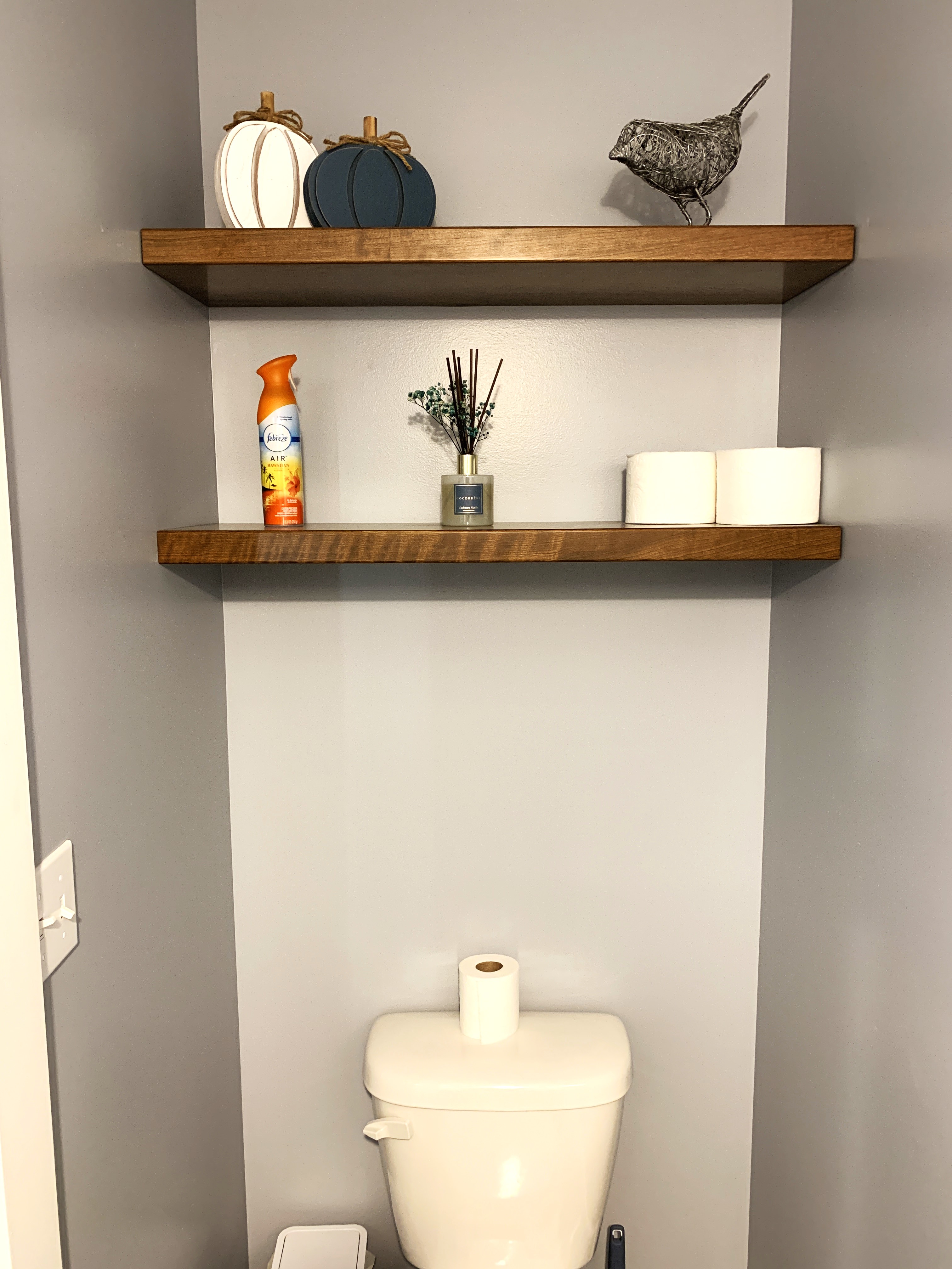 Actually, let’s start with Rite Aid: I got six of the CUTEST lil wooden pumpkins there and decided that they’d be great in the bathrooms.